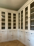 Regelmatig plaatsen wij een boekenkast in hoekopstelling. Met een boekenkast in een hoekopstelling creëert u thuis die intieme bibliotheeksfeer. De hoek van een kamer krijgt met een hoekkast funtie én uitstraling. Het voorbeeld op deze foto laat een schuine hoek zin in plaats van een 90 graden hoek. Voor deze boekenkast is er gekozen voor een grijze buitenzijde gecombineerd een witte binnenzijde. Het onderdeel is uitgerust met deurtjes en uittrekplanken. Door de verstelbare planken kan de kast naar wens ingericht worden.