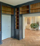 Deze kamer is door de boekenkasten rondom te plaatsen getransformeerd tot blibliotheekkamer. De bibliotheekkast is volledig vervaardigd van massief hout. Gekozen is voor een klassieke en tijdloze profilering voor deze thuisbibliotheek. De buitenzijde van de kast is voorzien van een handgeschilderde donkere grijstint, gecombineerd met een warme houtkleurige binnenzijde. Het bovendeel is uitgerust met open vakken, met daarin verstelbare planken. Het onderdeel is uitgevoerd met deurtjes, met eveneens een verstelbare plank. Ook zijn er in het onderdeel van de kast uitschuifplanken aangebracht als extra detail. Deze uitschuifplanken zijn tevens handig te gebruiken als aflegruimte. Tot slot hebben wij de kast voorzien van fraaie bronskleurige kastverlichting. Door te kiezen voor kastverlichting wordt ook 's avonds de boekenkast prachtig uitgelicht.
